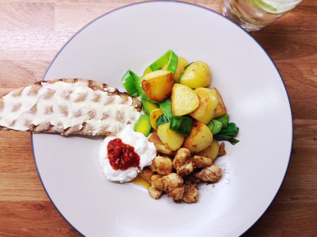 - Grov hackad potatis stekt i stekfett med purjolök och salt