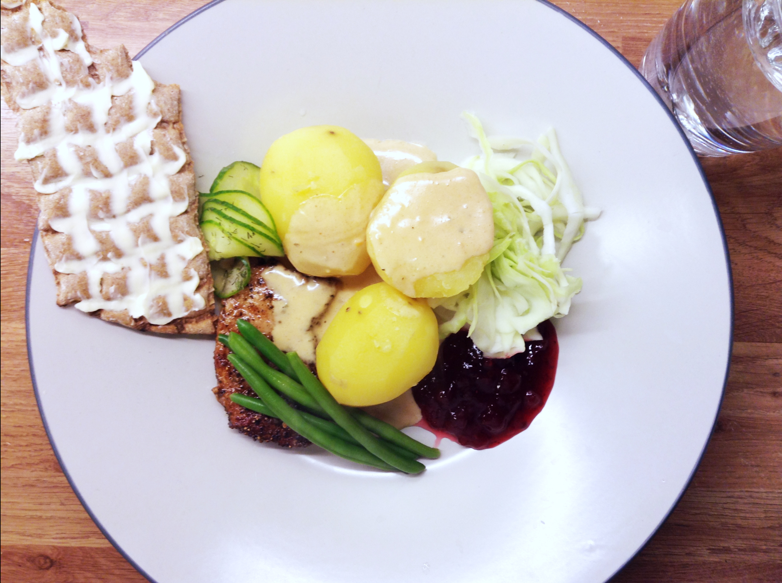 Köttbit med potatis, sås, grönsaker och lingonsylt
