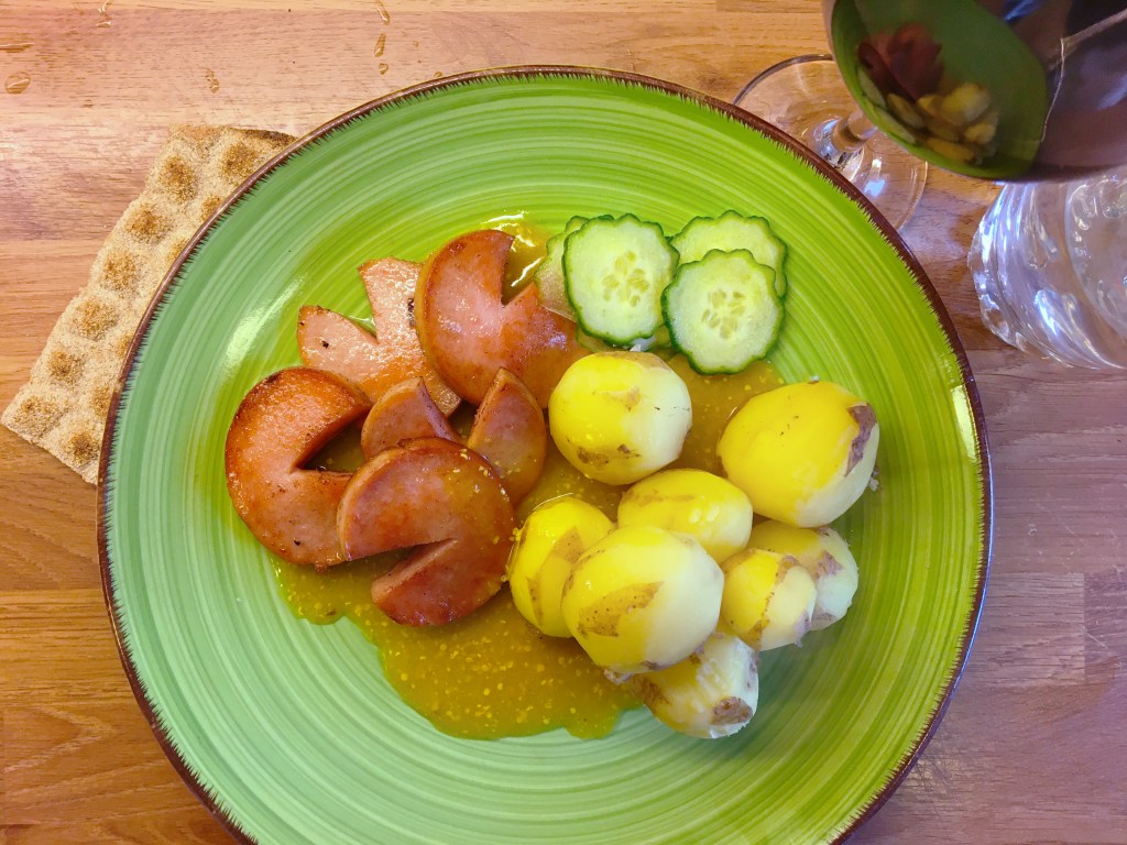 Falukorv med potatis, senapssås och gurka