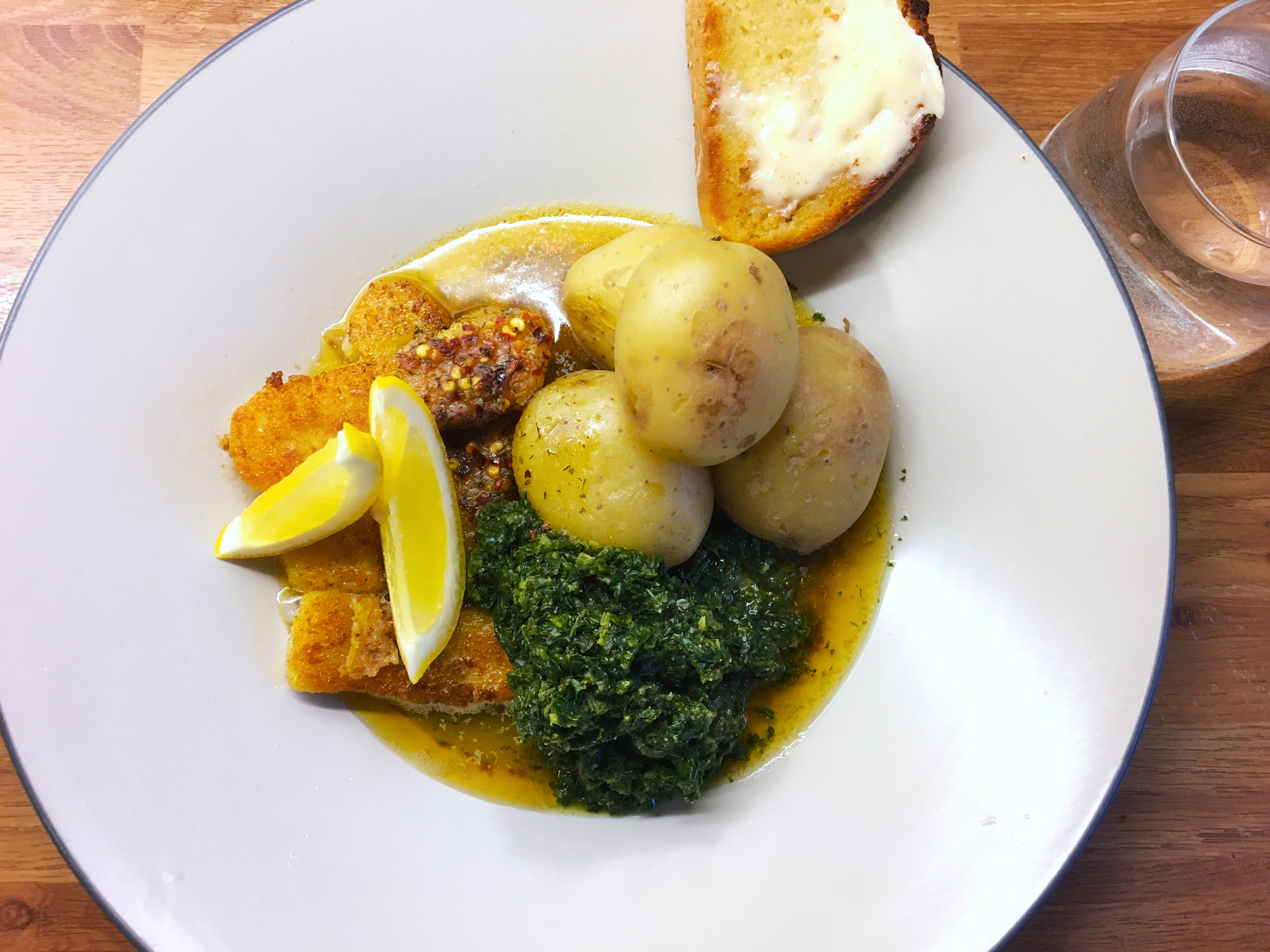 Panerad fisk med potatis, spenat, chill-skirat smör