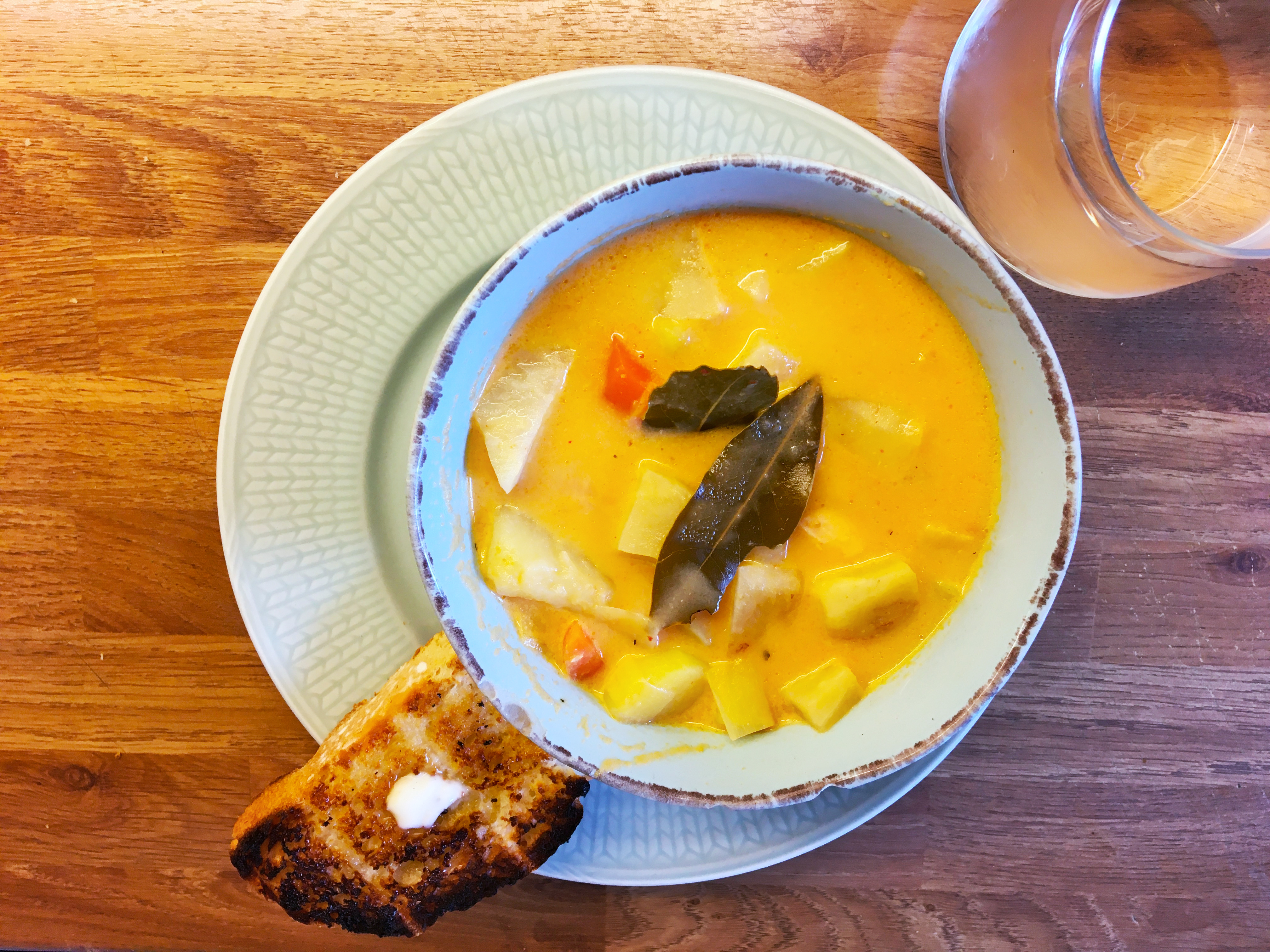 - 1 del tärnad potatis, morötter, palsternacka, purjolök, rotselleri, lax, tomatpuré med grädde, buljong, lagerblad, ljus öl, röd curry(första användare med röd curry kan ha överseende med hettan) och vatten kokt i kokkärl