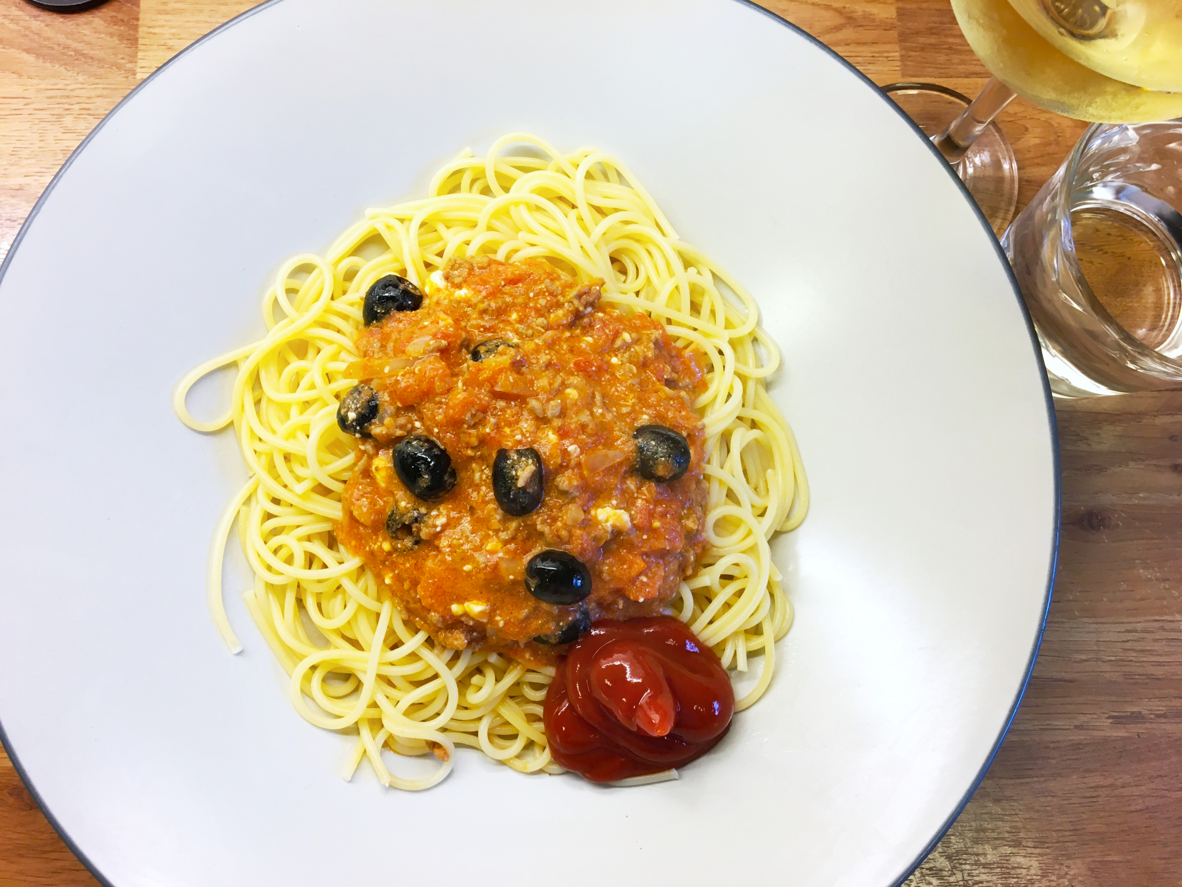 - 1 del nötfärs stekt i stekfett, krossade tomater, mörk buljong, ättiksprit, citron, honung, svarta oliver, får- eller getost och gul lök