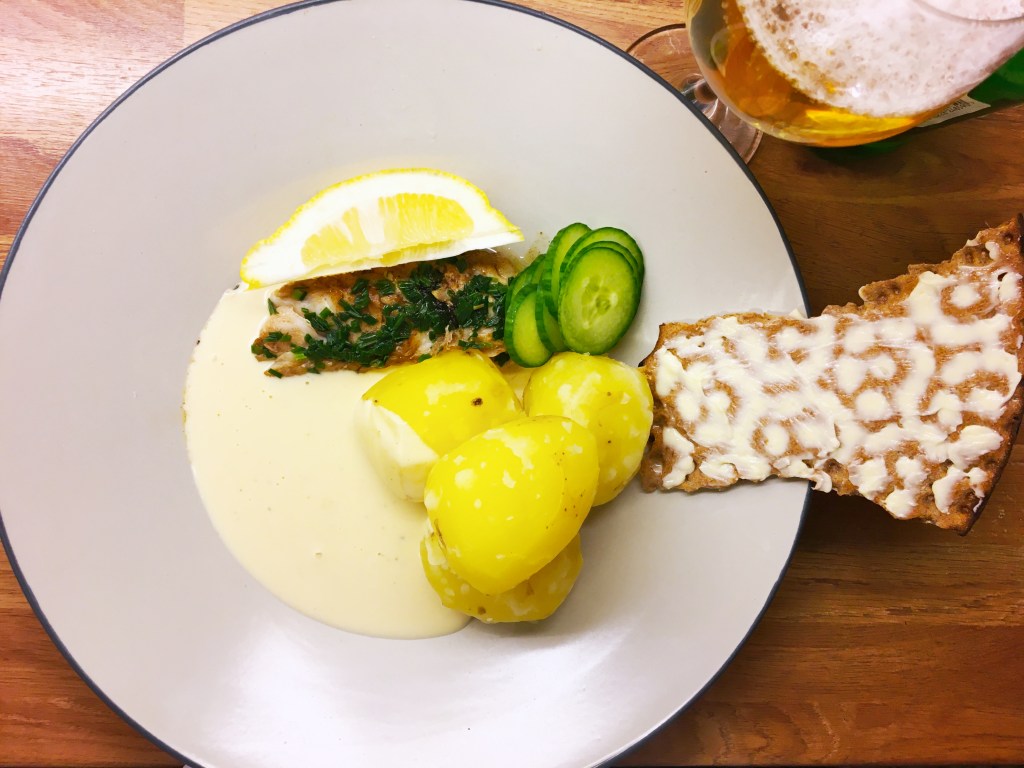 - 1 del torskryggfilé stekt i stekfett med salt citron lagd med gräslök