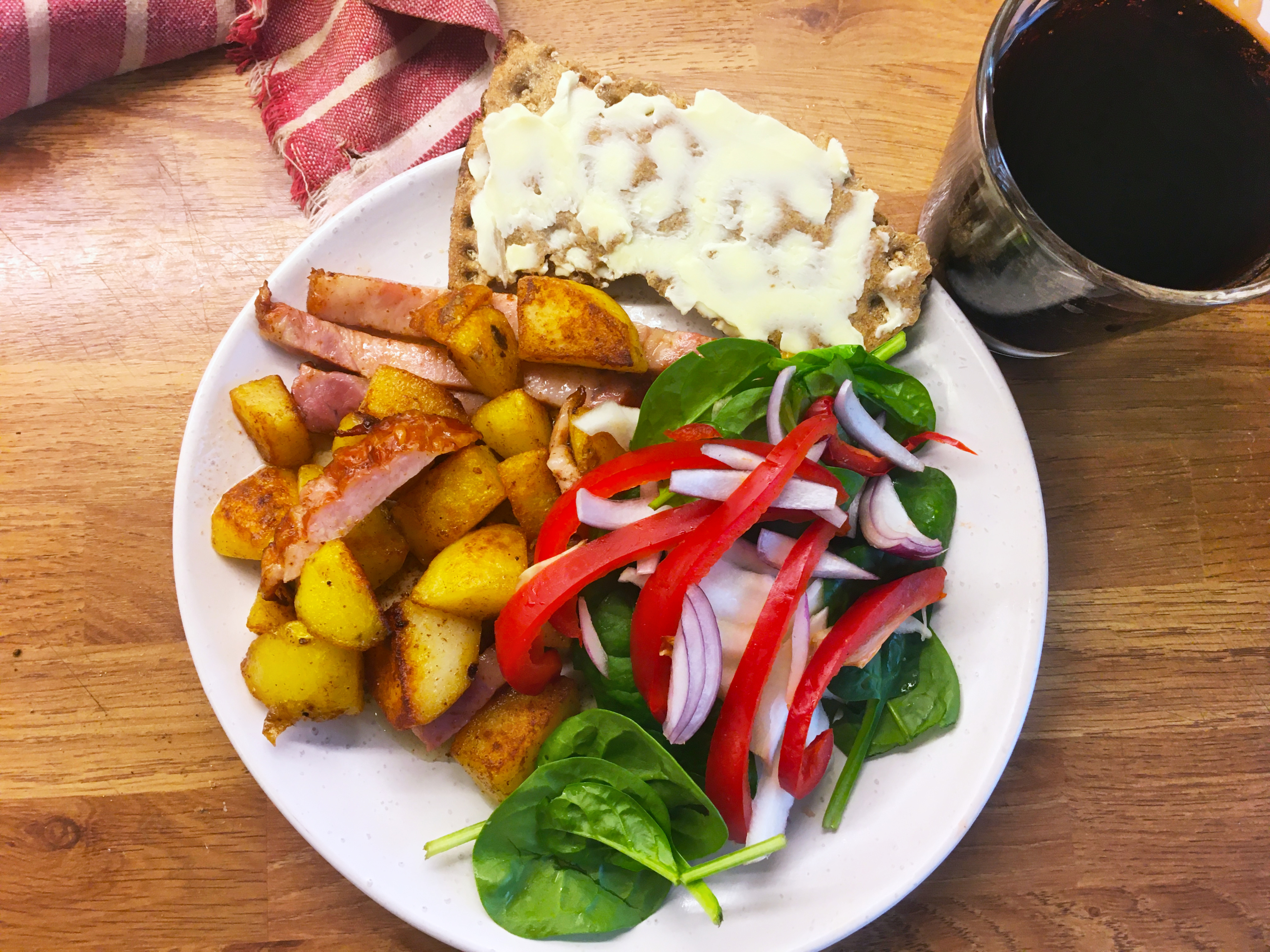 - Sallad(bladspenat, strimlad paprika, röd lök, olivolja, citron och salt)